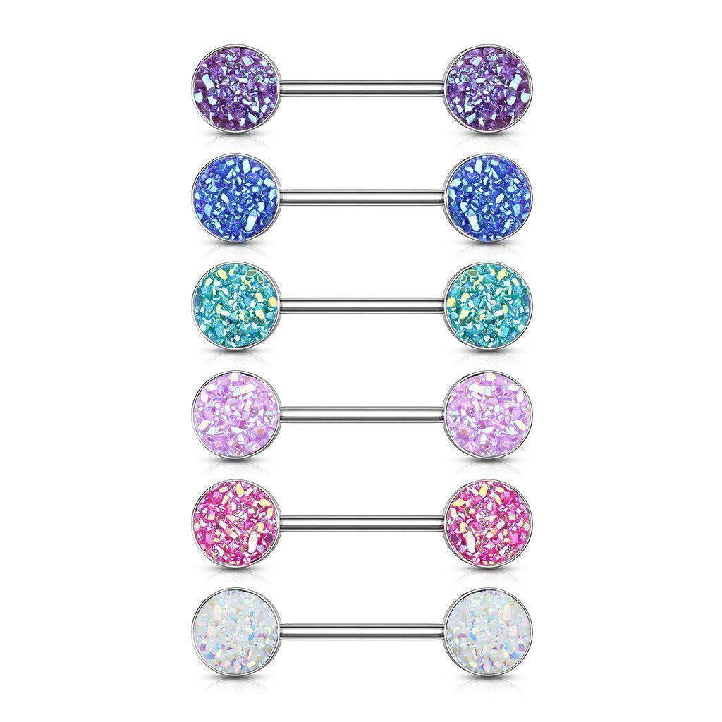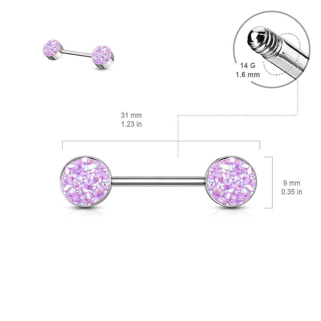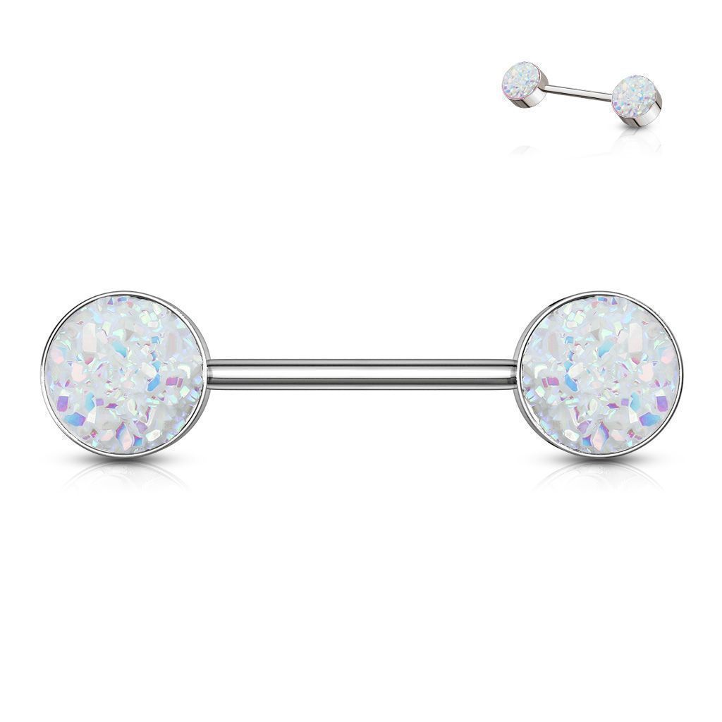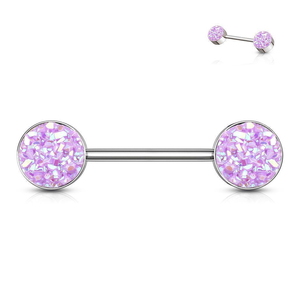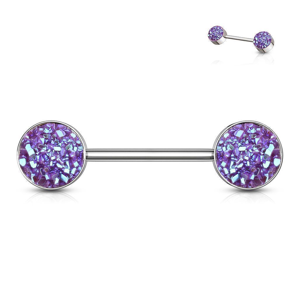 Piercing do bradavky s ozdobami s krystaly. Šroubovací je pouze jedna ozdoba, druhá je přidělaná napevno.