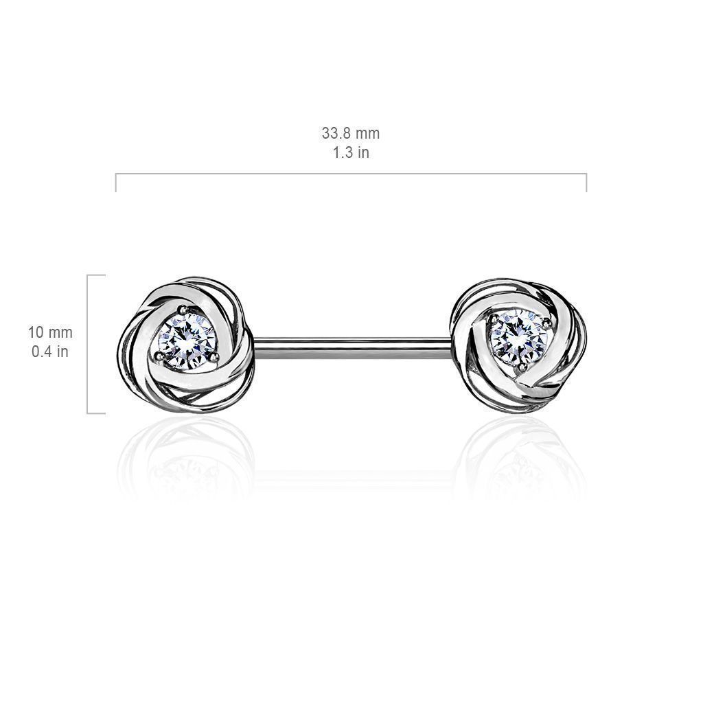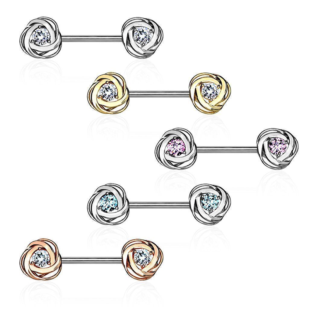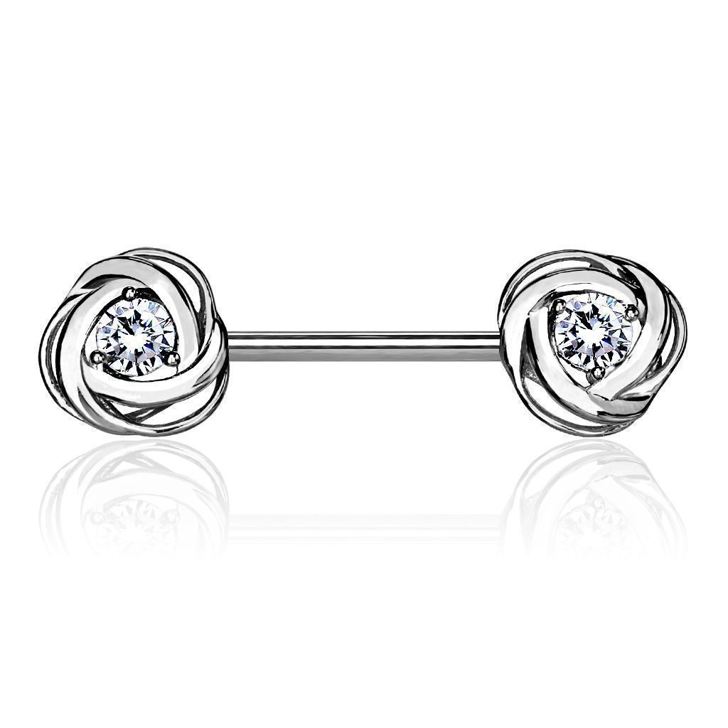 Piercing do bradavky s ozdobami s čirými zirkony. Šroubovací je pouze jedna ozdoba, druhá je přidělaná napevno.