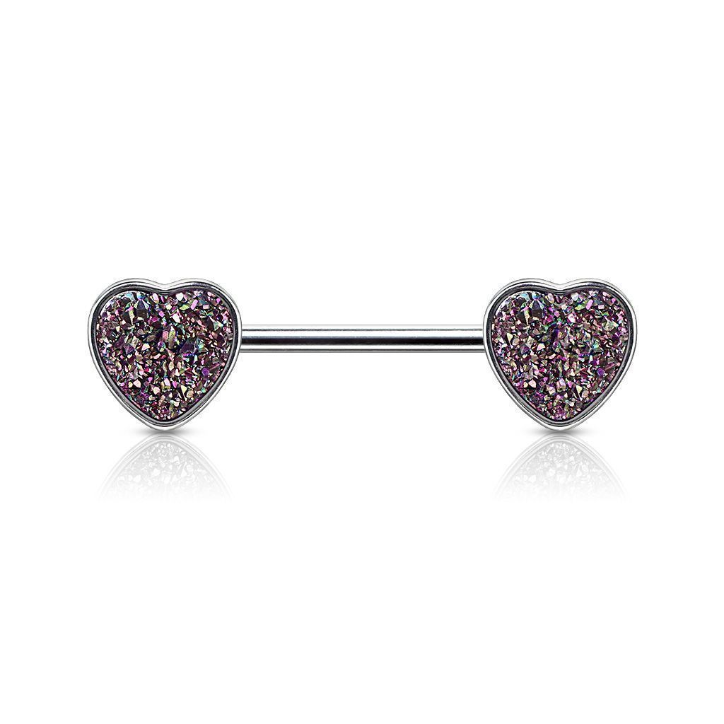 Piercing do bradavky s ozdobami srdíček. Srdce jsou zdobená kamínky.