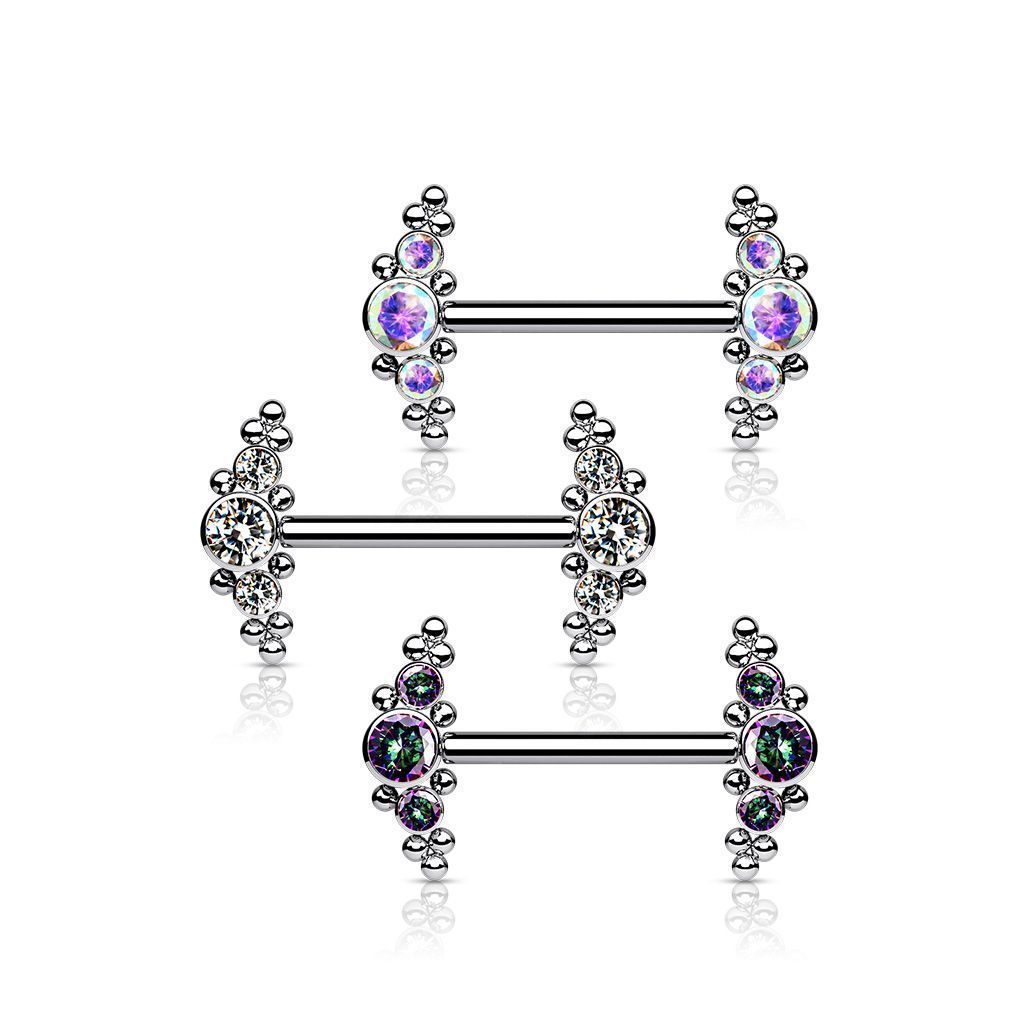 Titanový piercing do bradavky s ozdobami se zirkony, dozdobené droboučkými kuličkami.