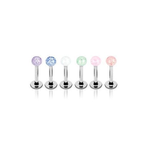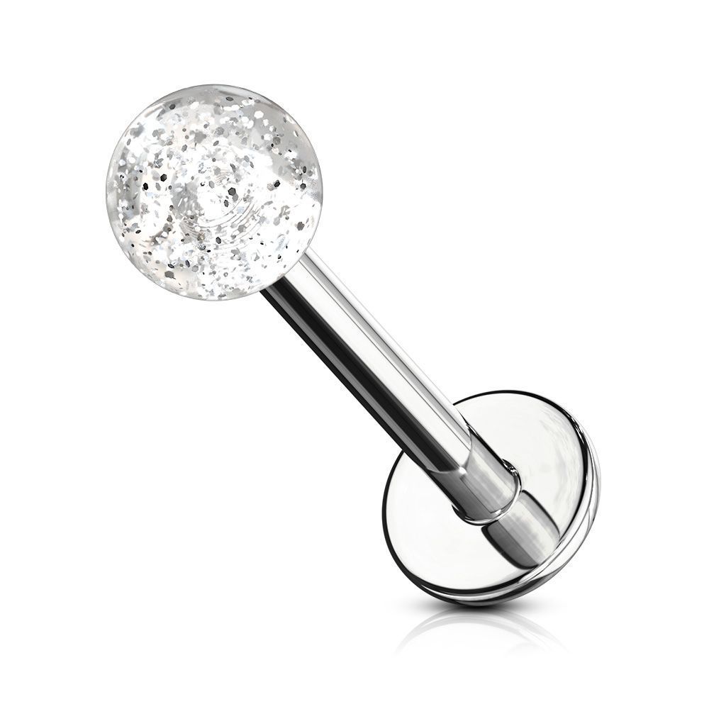 Tyčka je vyrobena z chirurgické oceli 316L, průhledná kulička s třpytkami je vyrobena z akrylátu.