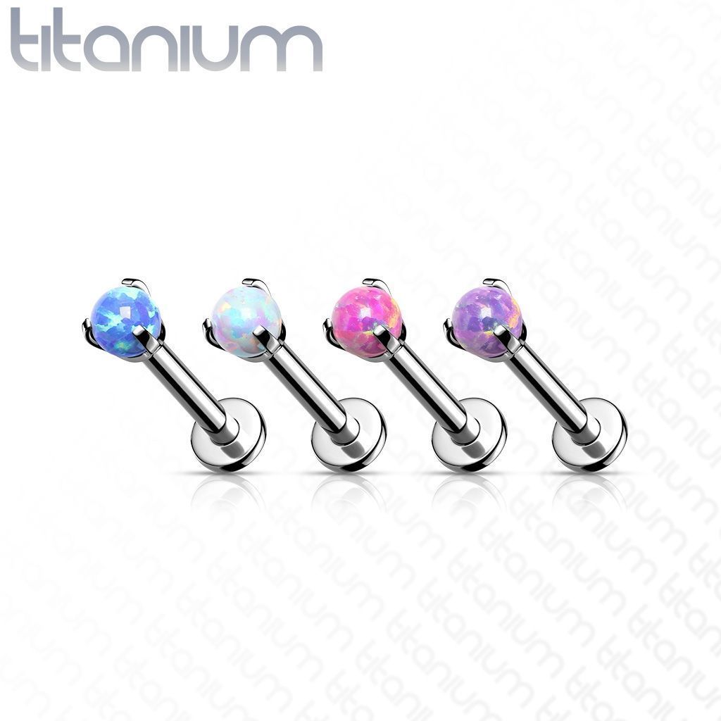Piercing do brady - labreta. Piercing je vyroben. z kvalitního titanu G23 a osazený kuličkou ze syntetického opálu.