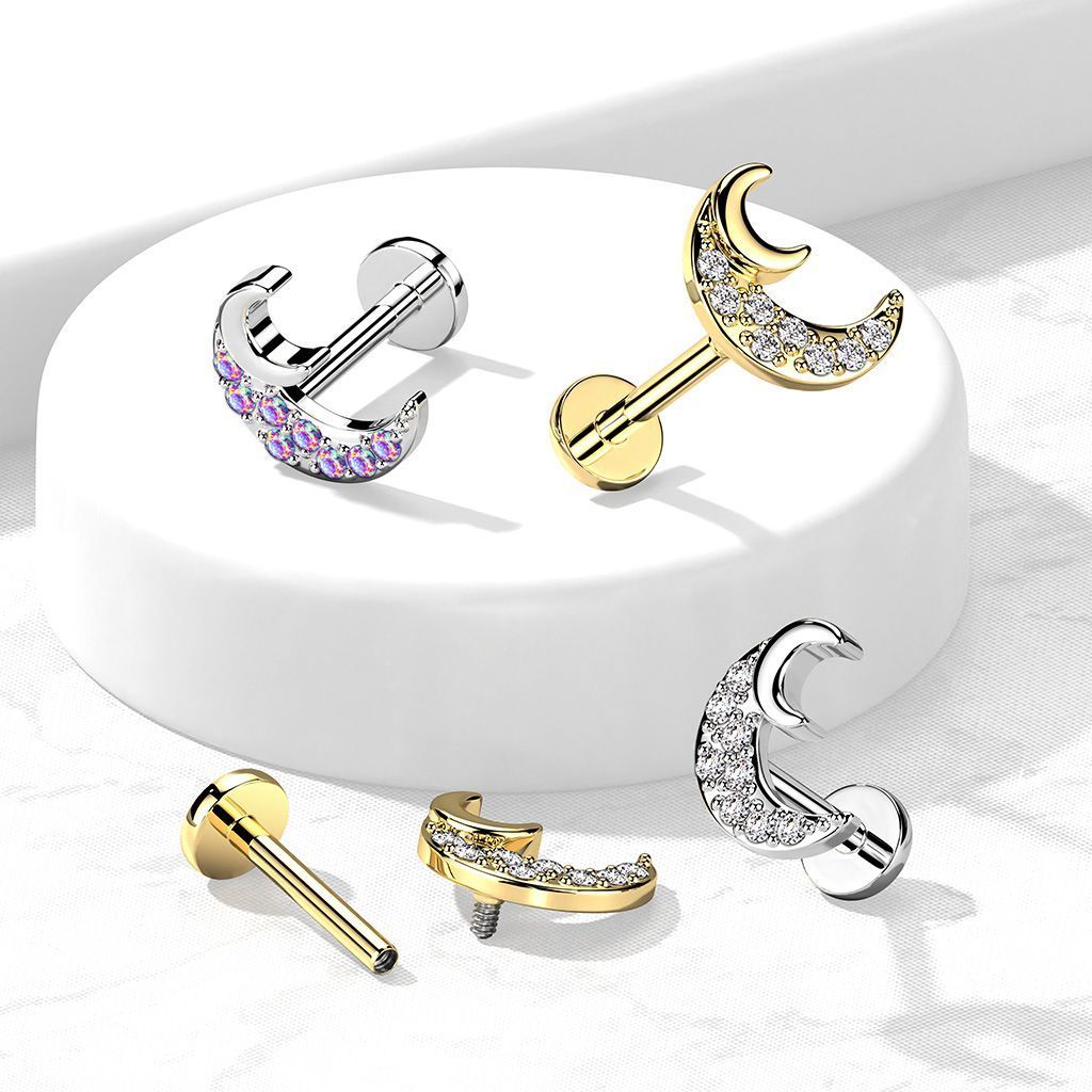 Piercing do brady s ozdobou ve tvaru měsíce se zirkony.