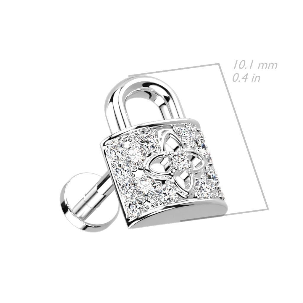 Piercing do brady zdobený zirkony a motivem zámku, který je zdoben čirými zirkony.