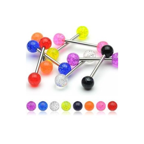 Piercing činka do jazyku. Akrylátové kuličky s glitry vyniknou na UV světle.