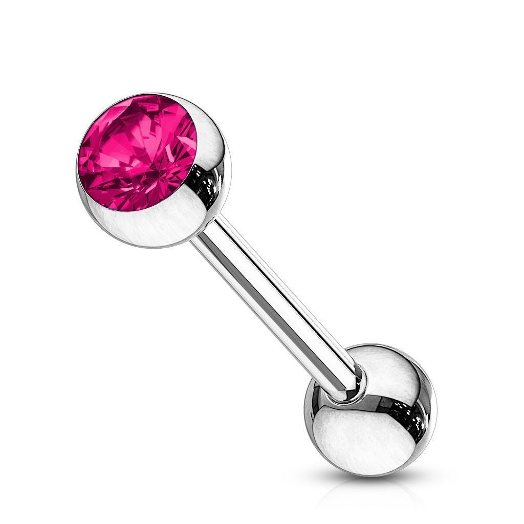 Piercing činka z chirurgické oceli používaná pro piercing jazyku. V jedné kuličce je zasazen zirkon.