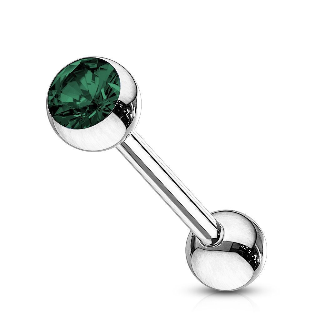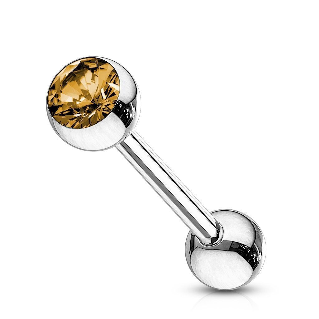 Piercing činka z chirurgické oceli používaná pro piercing jazyku. V jedné kuličce je zasazen zirkon.
