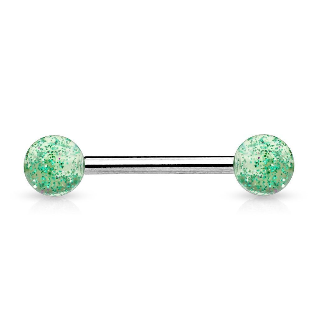Piercing činka do jazyku. Kuličky s třpytkami vyniknou na UV světle.