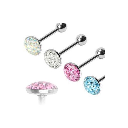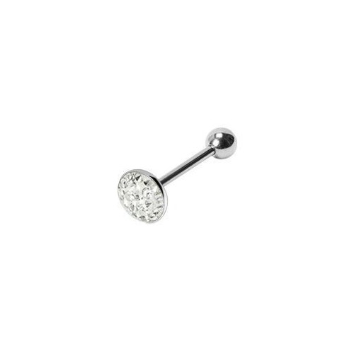 Piercing činka do jazyku s kulatou placičkou. Placička je zdobena třpytivými krystalky. Kraystaly jsou potaženy vrstvou bezbarvé pryskyřice, která brání jejich vypadávání.