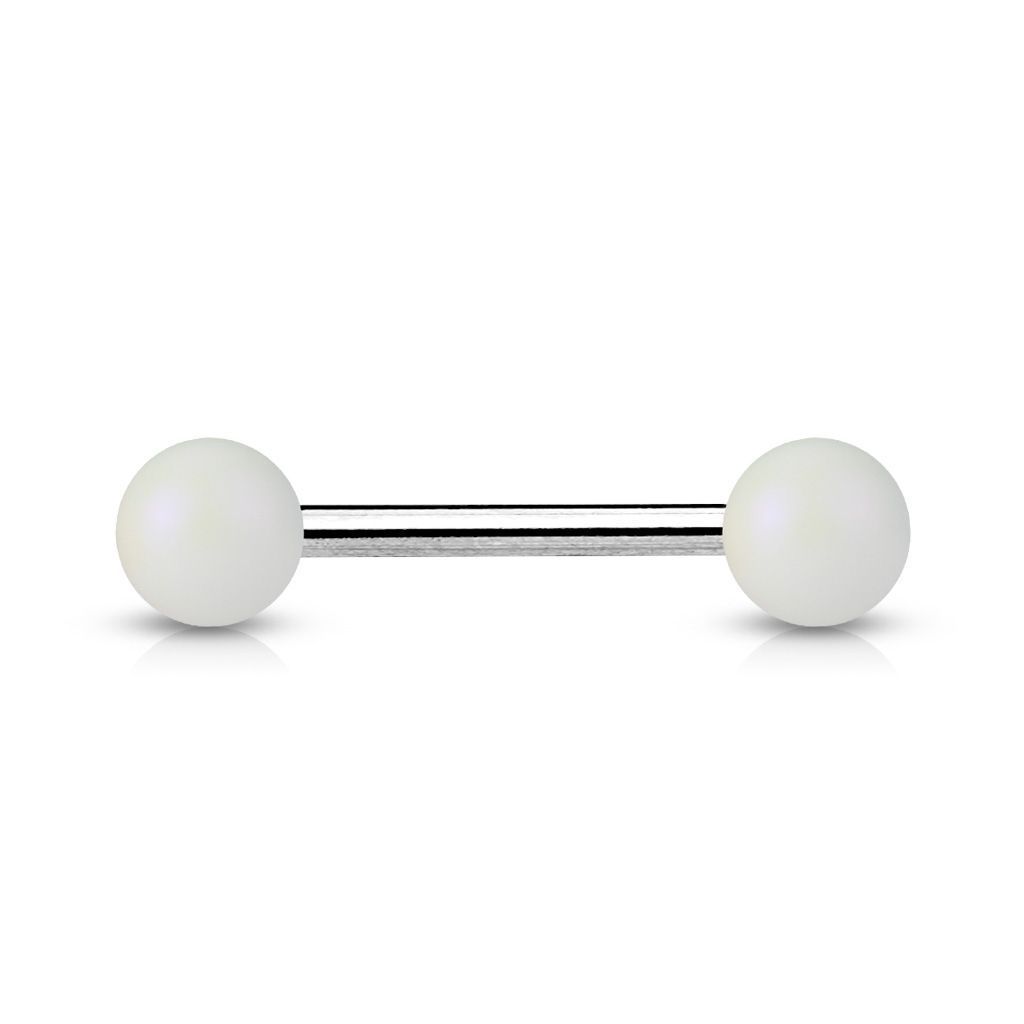 Piercing do jazyka z chirurgické oceli 316L. Kuličky piercingu mají perleťovou barvu
