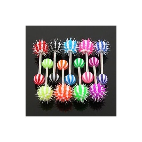 Piercing činka do jazyku se silikonovou kuličkou. Spodní pruhovaná kulička je z akrylátu.