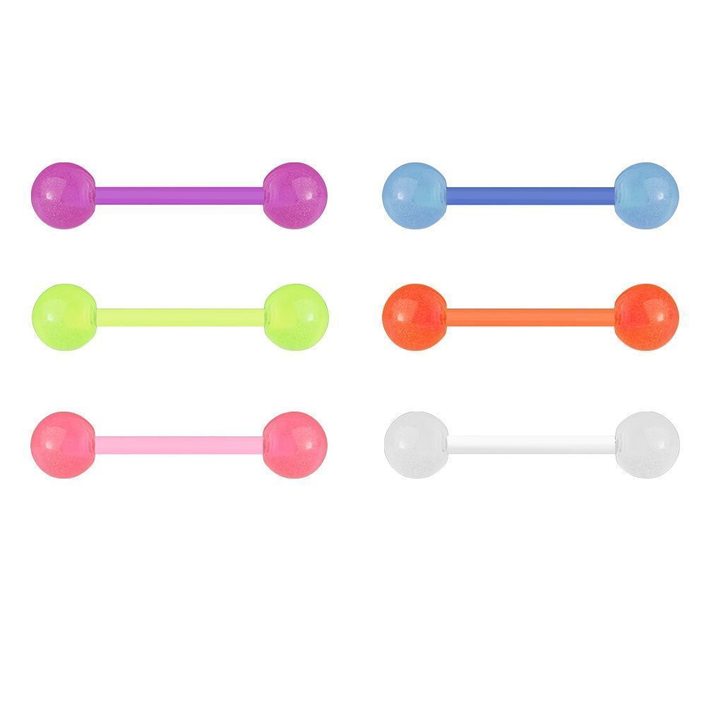Piercing do jazyku činka. Piercing je vyroben z bioplastu. S fosforeskujícími akrylátovými kuličkami (kuličky po nasvícení svítí ve tmě).