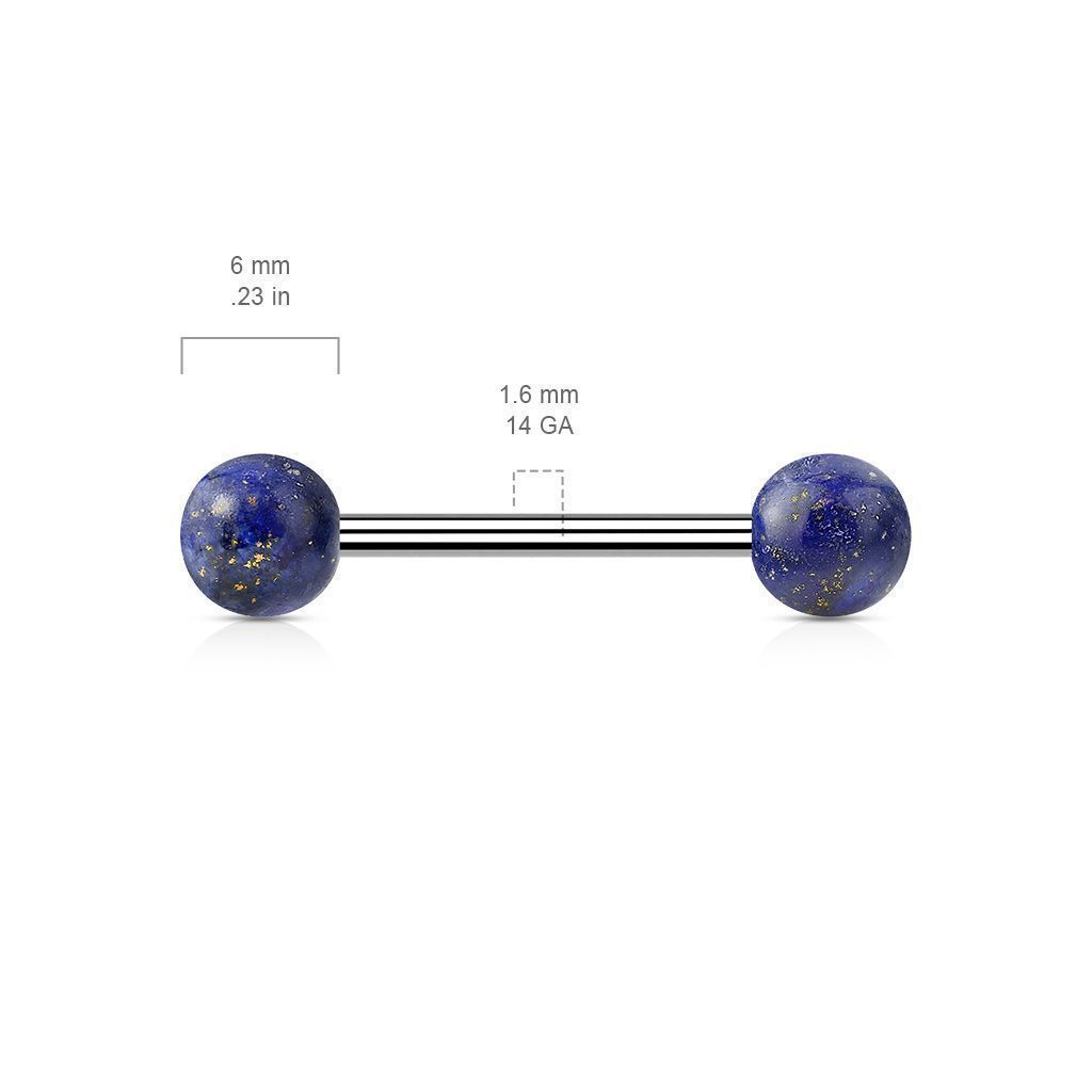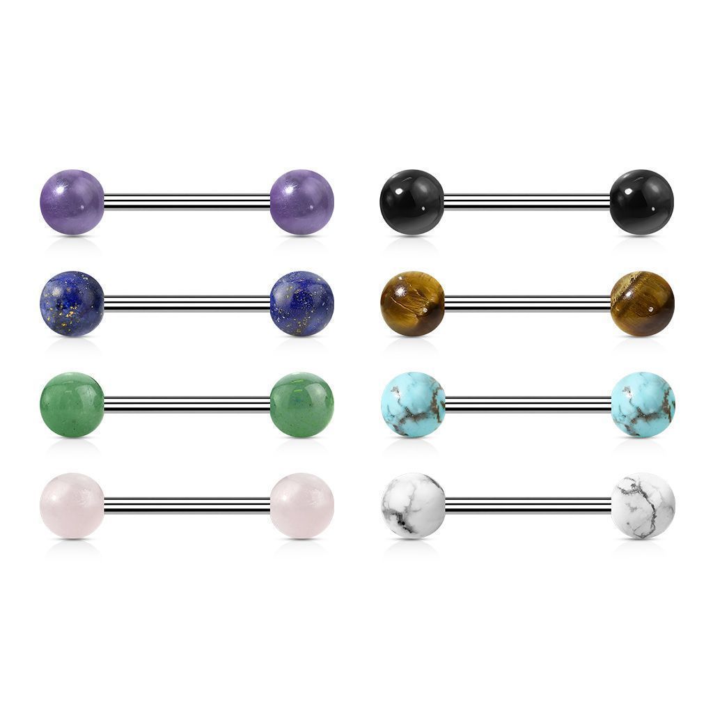 Piercing do jazyku - činka s vnitřním závitem a kuličkami z přírodního kamene o průměru 6 mm.