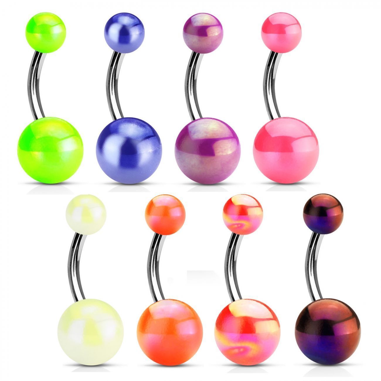 Piercing banánek do pupíku, chirurgická ocel s akrylátovými metalickými kuličkami.