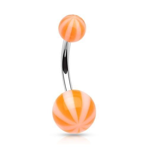 Piercing banánek s pruhovanými akrylátovými kuličkami.