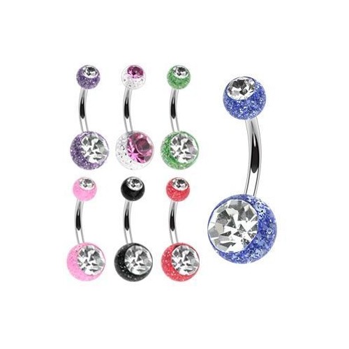 Piercing banánek do pupíku, chirurgická ocel s třpytkovými akrylátovými kuličkami, které vyniknou pod UV světlem. Kuličky jsou navíc osazeny zirkony.
