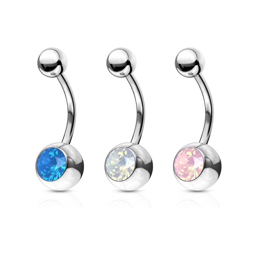 Piercingový šperk určený pro piercing pupíku. Ve velké kuličce je zasazený broušený opál.