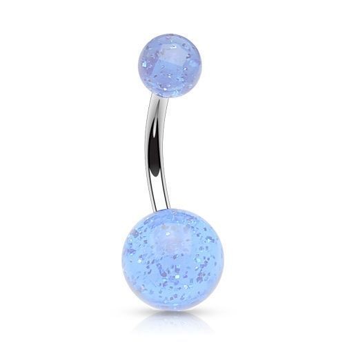 Piercing banánek do pupíku s akrylátovými kuličkami se třpytkami. Kuličky vyniknou pod UV světlem.
