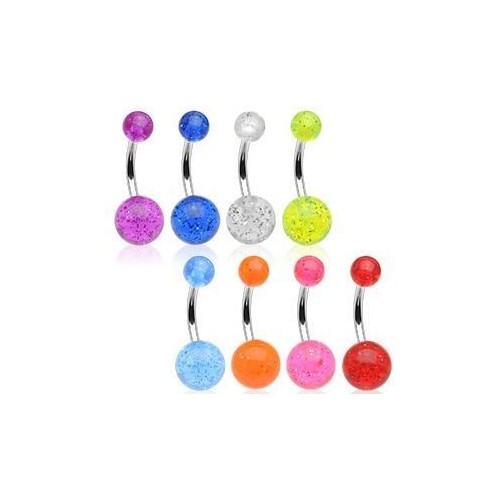 Piercing banánek do pupíku s akrylátovými kuličkami se třpytkami. Kuličky vyniknou pod UV světlem.