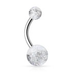 Piercing banánek do pupíku s akrylátovými třpytkovými kuličkami. Kuličky vyniknou pod UV světlem.