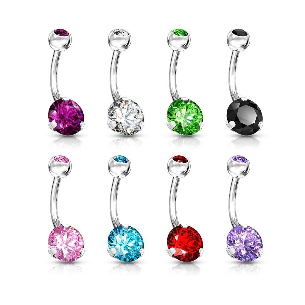 Piercingový šperk určený pro piercing pupíku. S velkým spodním zirkonem a malým zirkonem zasazeným v horní kuličce.
