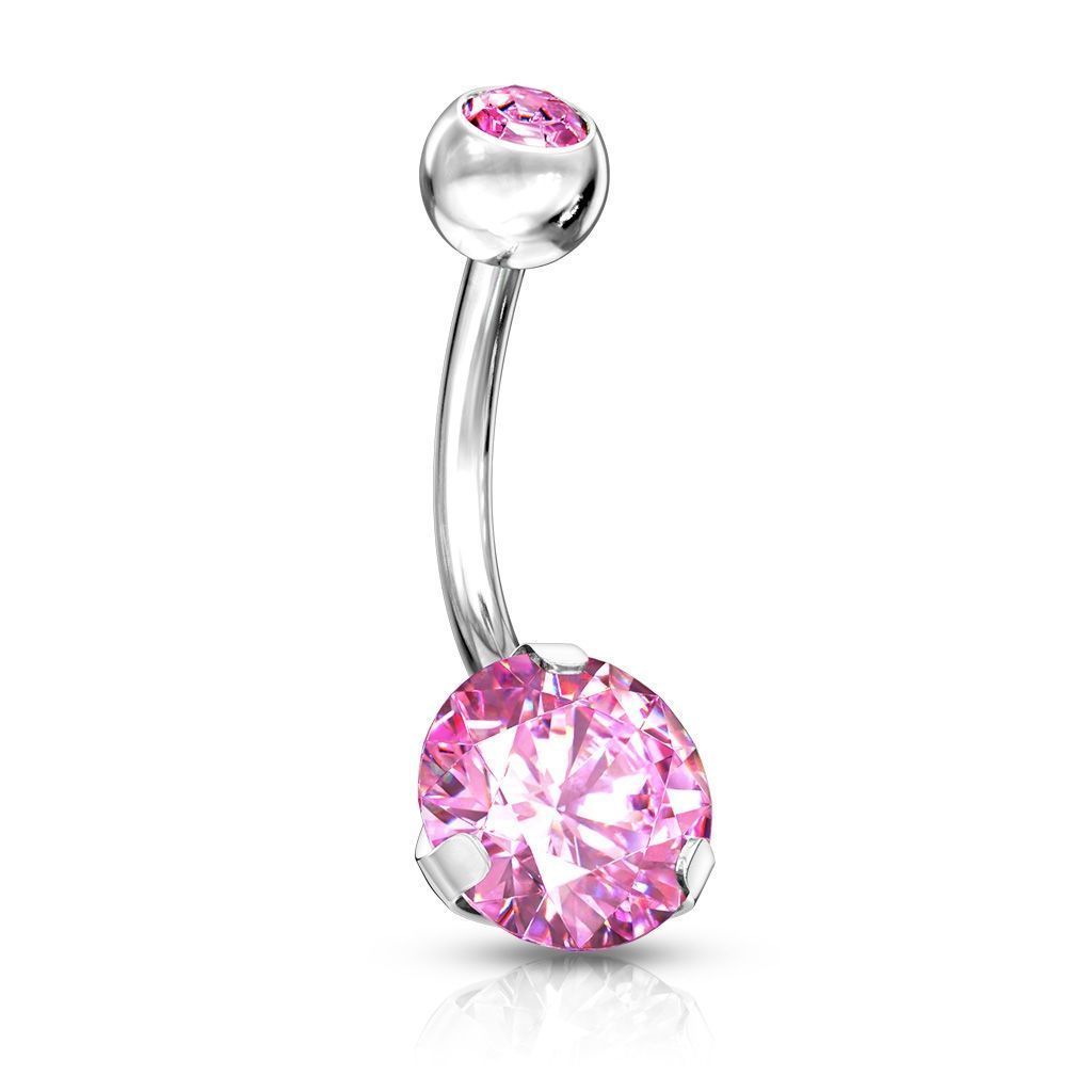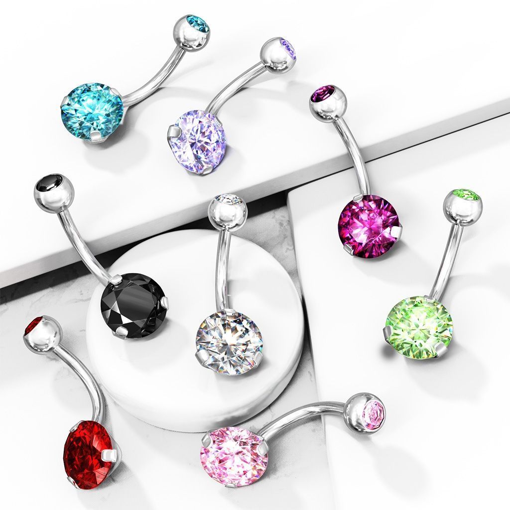 Piercingový šperk určený pro piercing pupíku. S velkým spodním zirkonem a malým zirkonem zasazeným v horní kuličce.