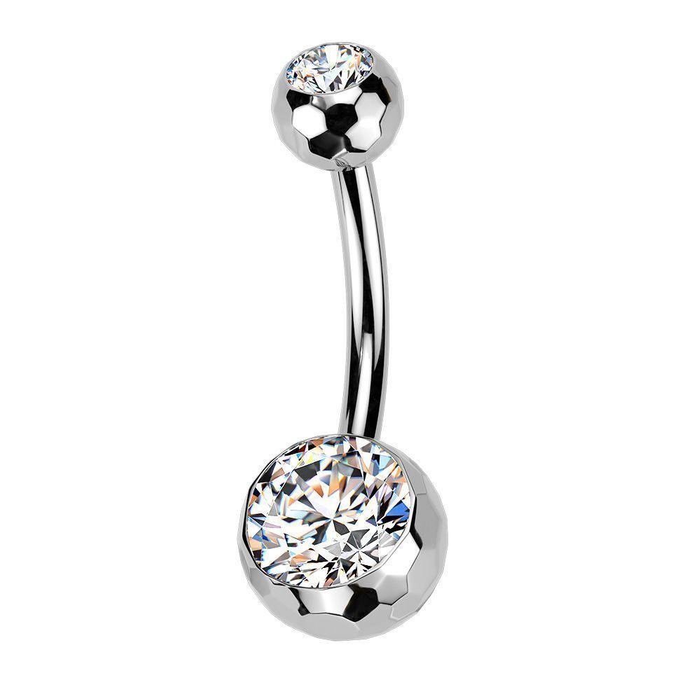 Titanový piercing do pupíku s vybrušovanými kuličkami se zirkony čiré barvy.