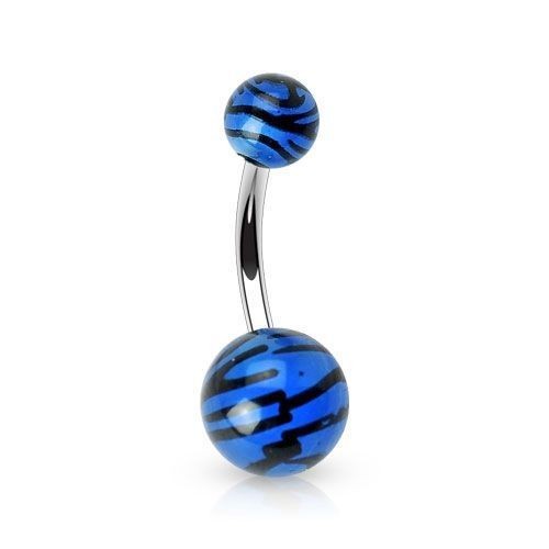 Piercing banánek do pupíku, chirurgická ocel s akrylátovými zebrovanými kuličkami, které vyniknou pod UV světlem. Zebra.