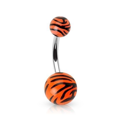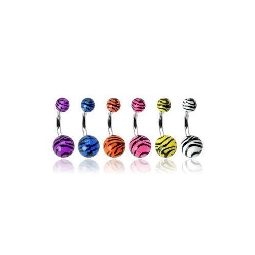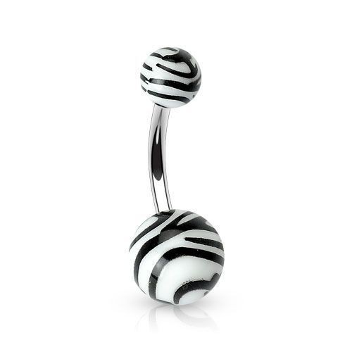 Piercing banánek do pupíku, chirurgická ocel s akrylátovými zebrovanými kuličkami, které vyniknou pod UV světlem. Zebra.
