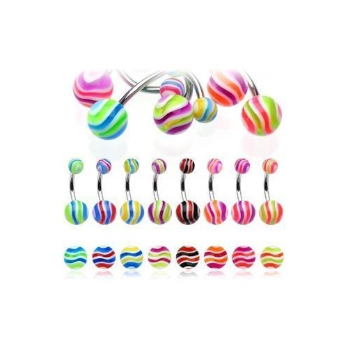 Piercing banánek do pupíku, chirurgická ocel s akrylátovými UV kuličkami, které vyniknou pod UV světlem.