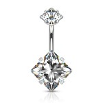 Piercingový šperk určený pro piercing pupíku. S ozdobou velkého broušeného kamene ve tvaru čtverce (kosočtverce).