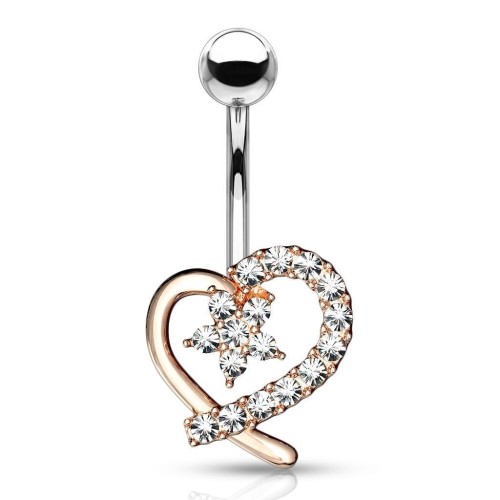 Piercingový šperk určený pro piercing pupíku. S ozdobou ve tvaru srdce z kvalitní bižuterie.