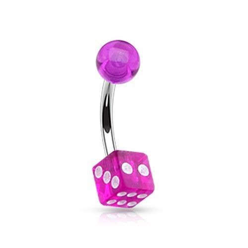 Piercing banánek do pupíku, chirurgická ocel s akrylátovými kuličkami, které vyniknou pod UV světlem. Hrací kostka.
