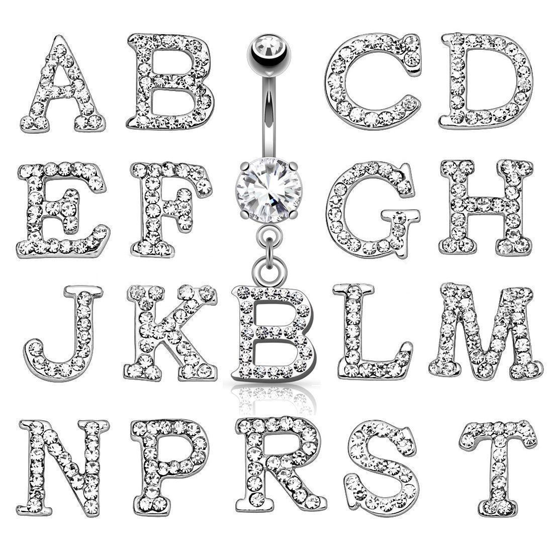 Piercing banánek do pupíku s přívěskem písmene s čirými zirkony. Písmenko, písmeno, iniciála.