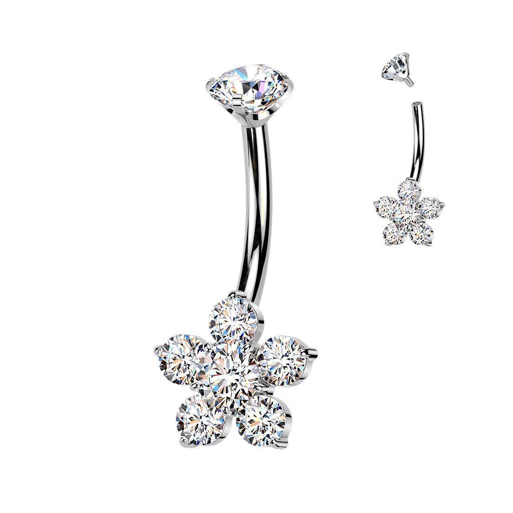 Piercing do pupíku z titanu G23 s kytičkou zdobenou čirými zirkony.