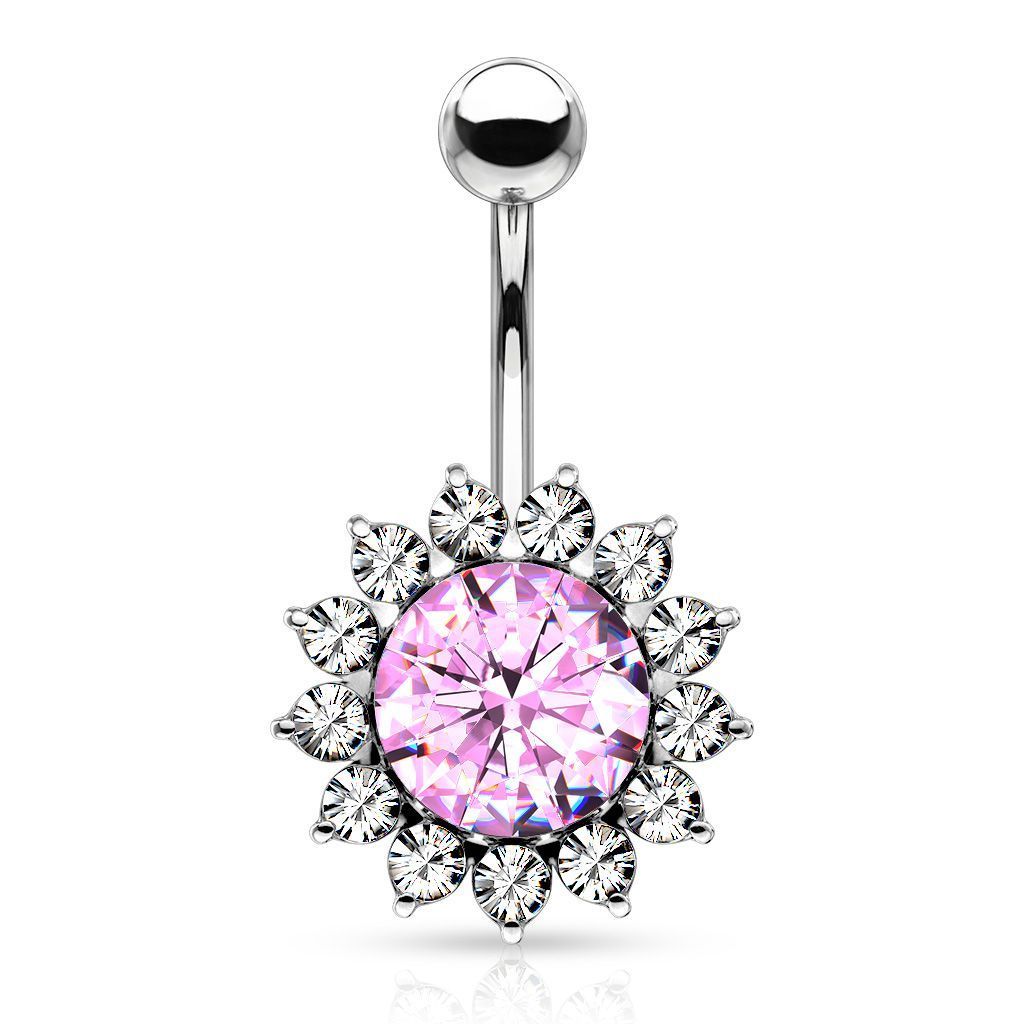 Piercingový šperk určený pro piercing pupíku. S ozdobou velkého květu z kvalitní bižuterie.