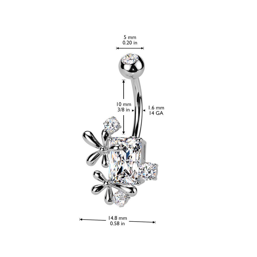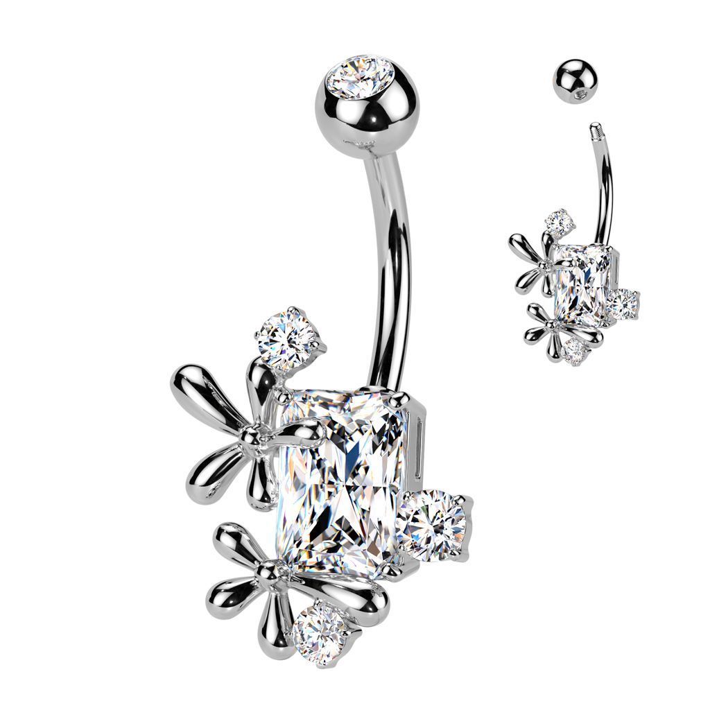 Piercingový šperk určený pro piercing pupíku. S ozdobou ve tvaru kytiček doplněnou čirými zirkony..