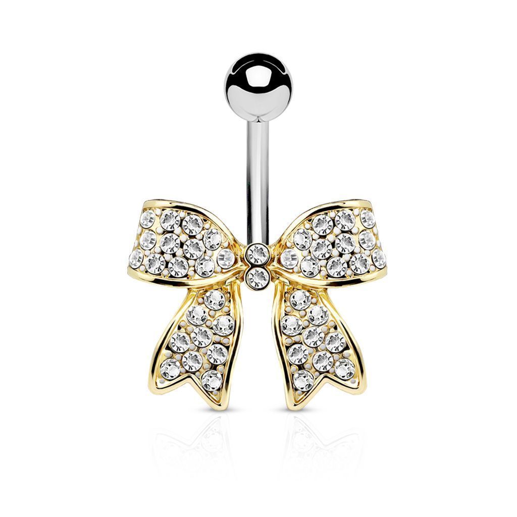 Piercing do pupíku zdobený kamínky. Ozdoba ve tvaru mašličky.