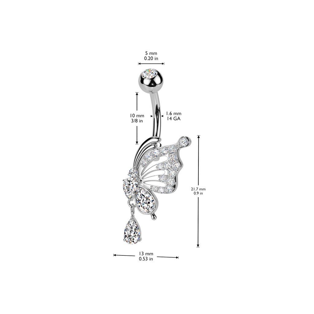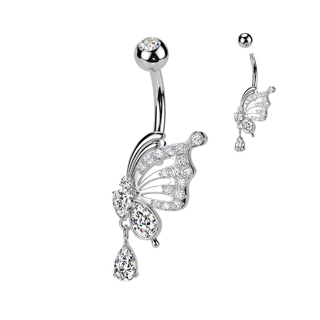 Piercingový šperk určený pro piercing pupíku. S ozdobou ve tvaru mmotýla, který je bohatě zdoben čirými zirkony.