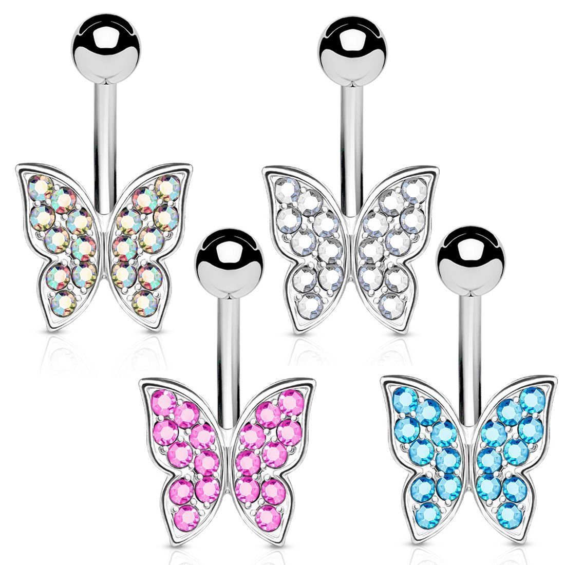 Piercing do pupíku. Piercing zdobený motýlem. Motýlek je osázen zirkony.