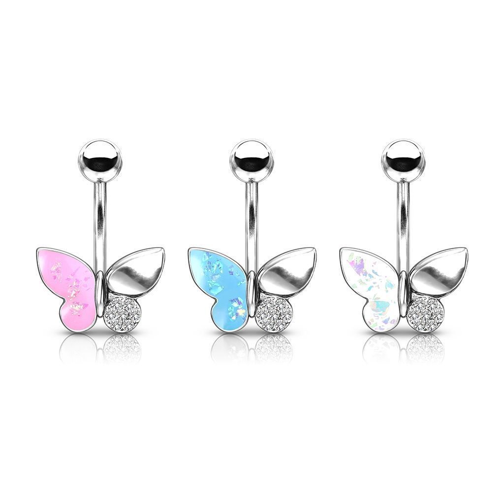 Piercing do pupíku. Piercing zdobený motýlem. Motýl je osazen třpytivou barevnou částí a zirkony.