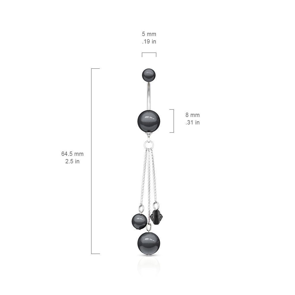 Piercing do pupíku s visací ozdobou s lesklými perličkovými akrylátovými kuličkami a korálkem.