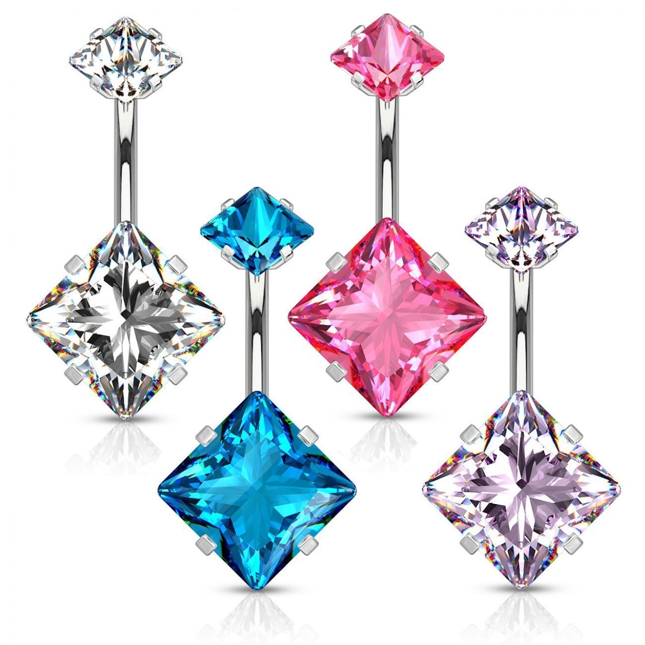 Piercingový šperk určený pro piercing pupíku. S ozdobou velkého broušeného kamene ve tvaru čtverce (kosočtverce).