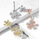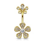 Piercing banánek do pupíku zdobený kvítky. Kytičky jsou zdobené čirými zirkony.