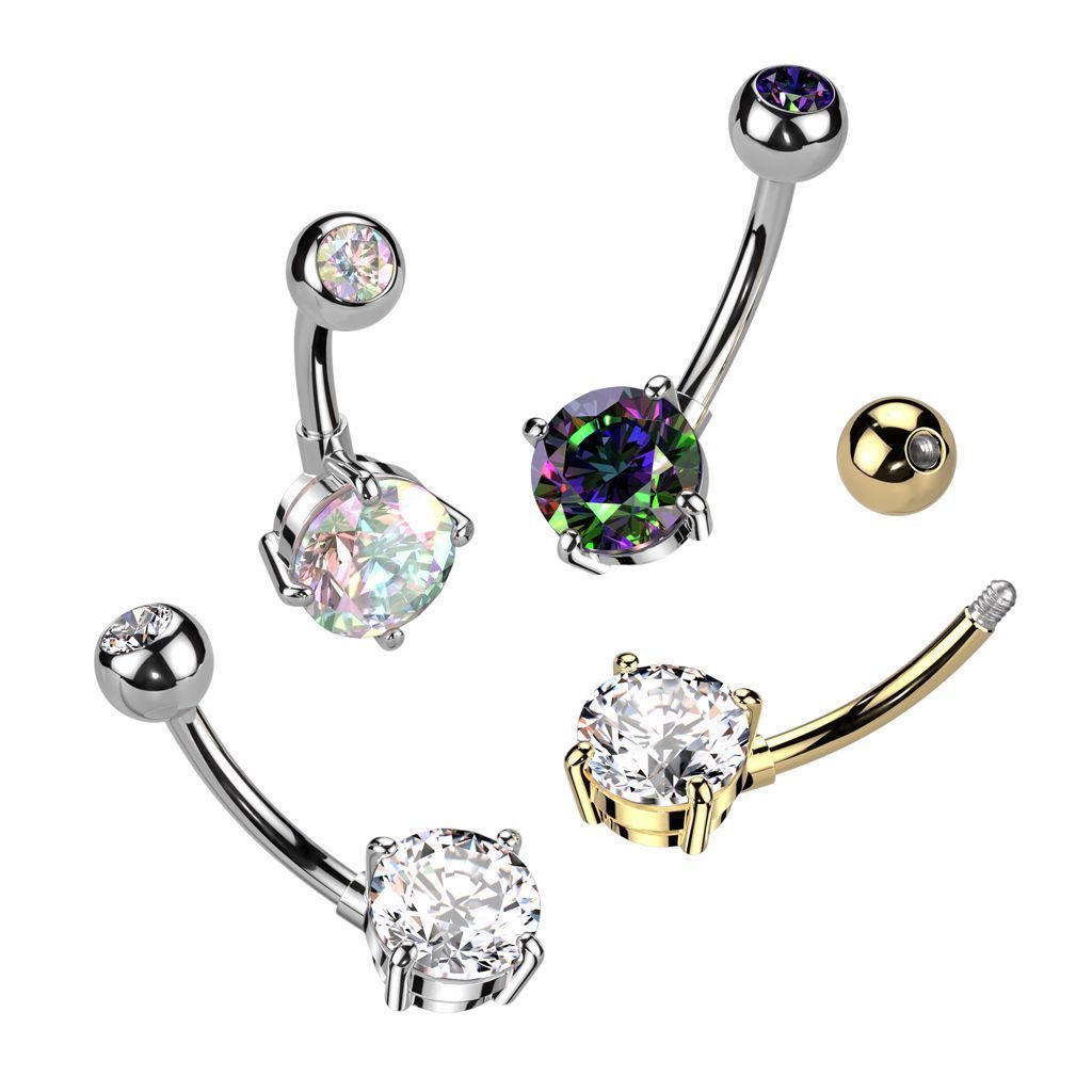 Piercingový šperk určený pro piercing pupíku. Se zirkonem kulatého tvaru.