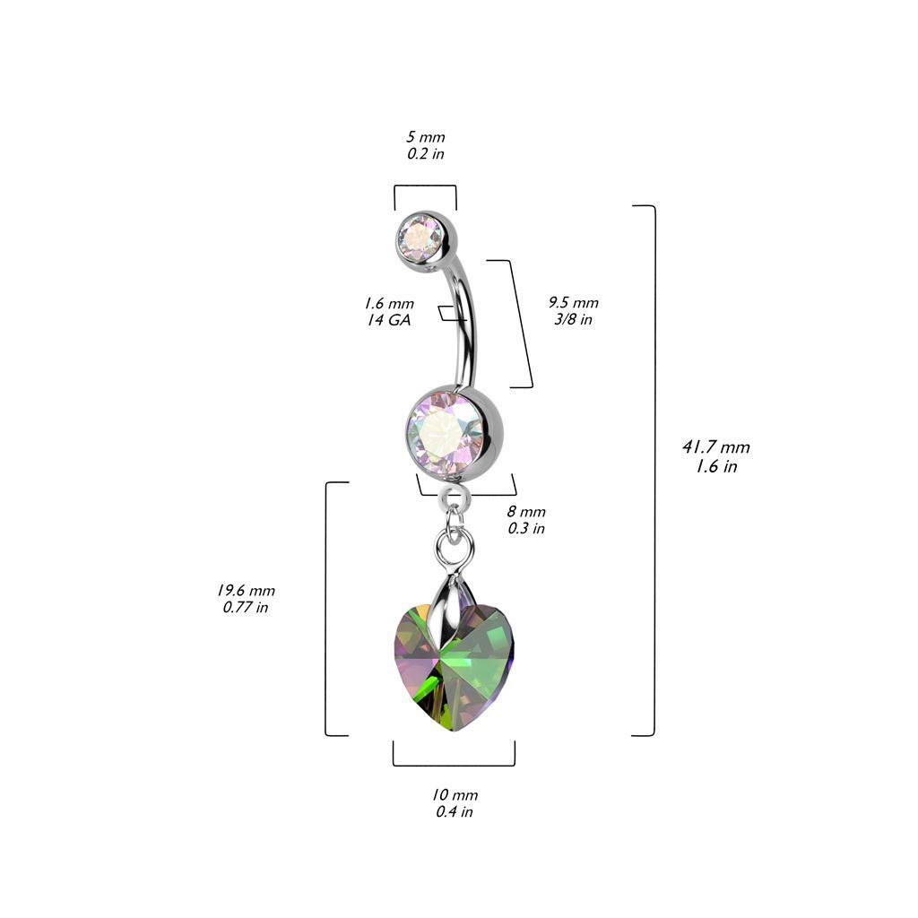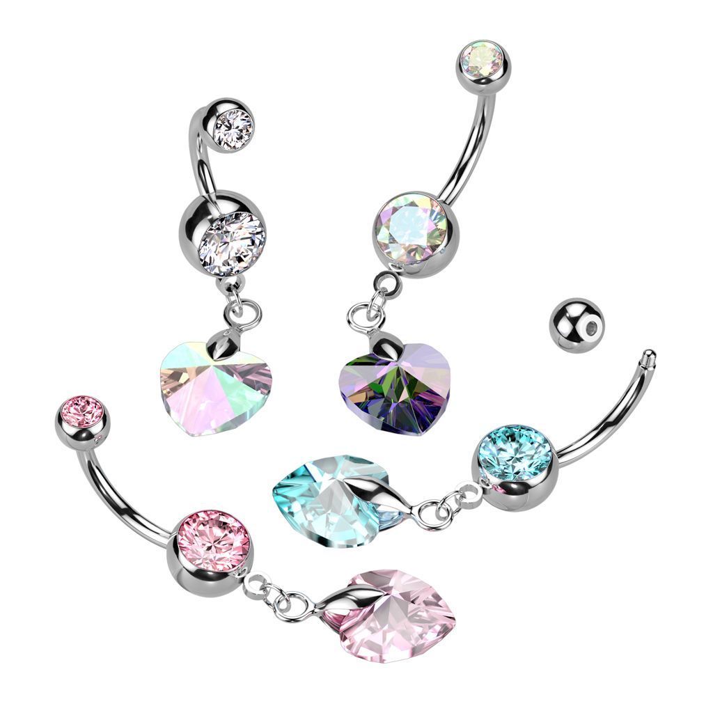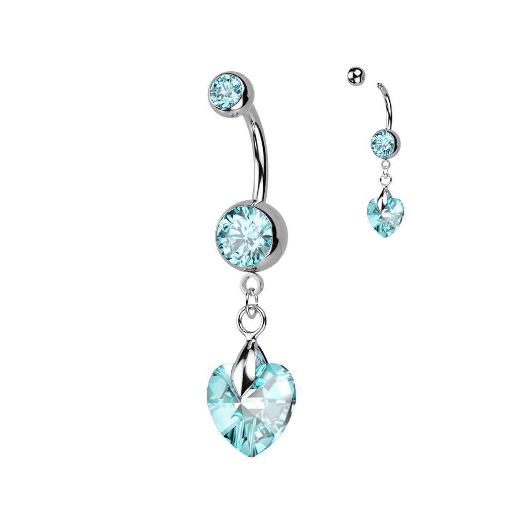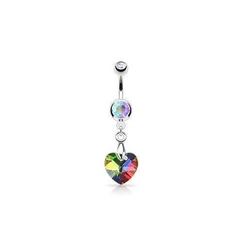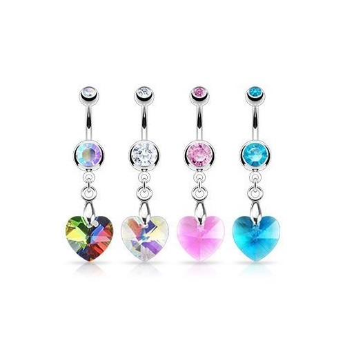 Piercing banánek do pupíku s visací ozdobou krystalu ve tvaru srdce.