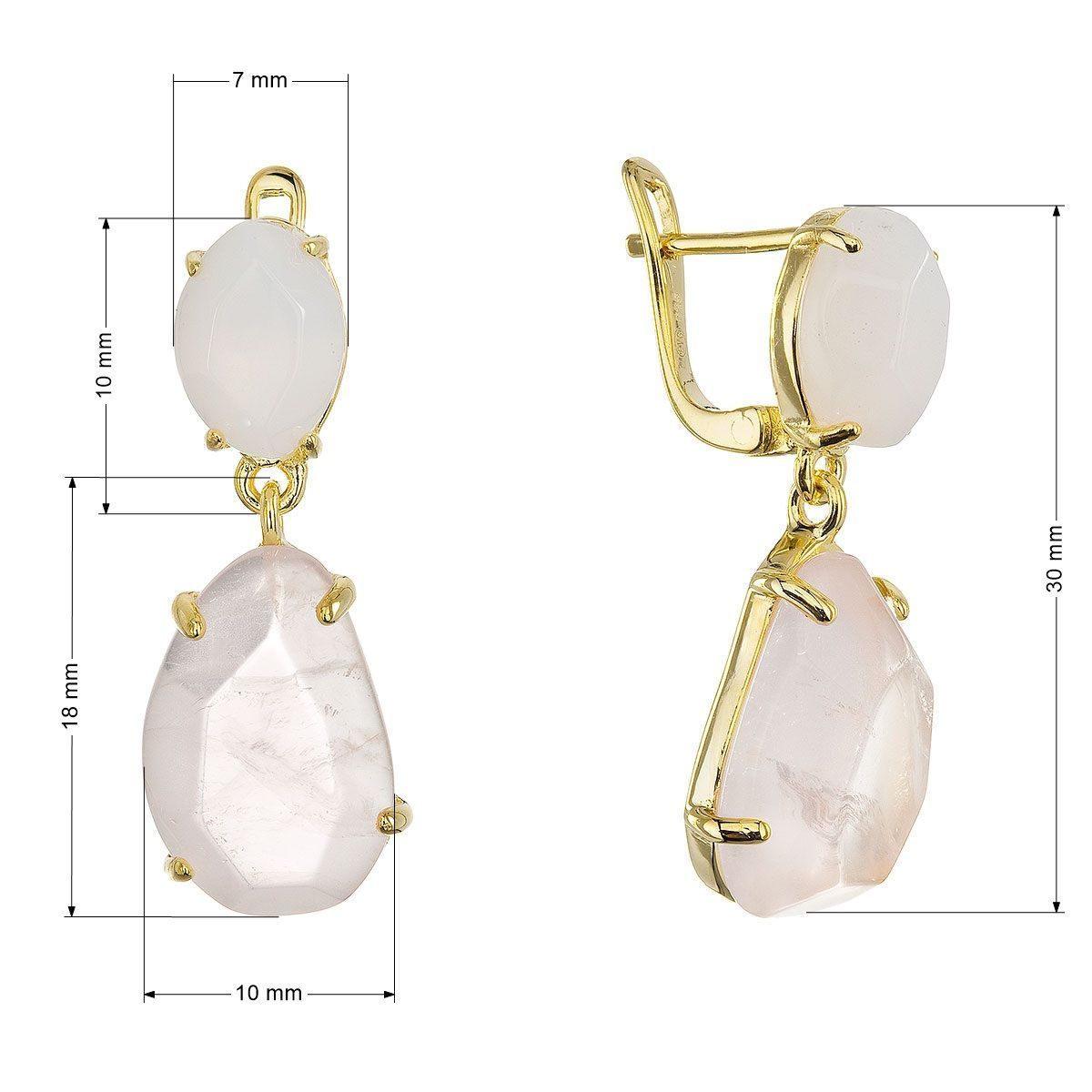 Náušnice jsou vyrobeny z pozlaceného stříbra nejvyšší kvality ryzosti 925/1000. Šperk zdobí dva vzácné kameny v nádherném, téměř sochařském provedení - větší, něžně růžový růženín a menší, jemně modrošedý chalcedon. Jejich vertikální uspořádání vytváří dynamickou kompozici plnou kontrastu a harmonie. Pozlacený povrch dodává náušnicím teplý, jemný lesk, který dokonale rozzařuje krásu kamenů. Pohodlné zapínání na ruský patent zaručuje spolehlivé a bezpečné nošení.