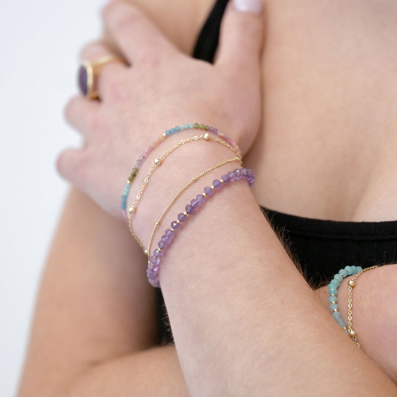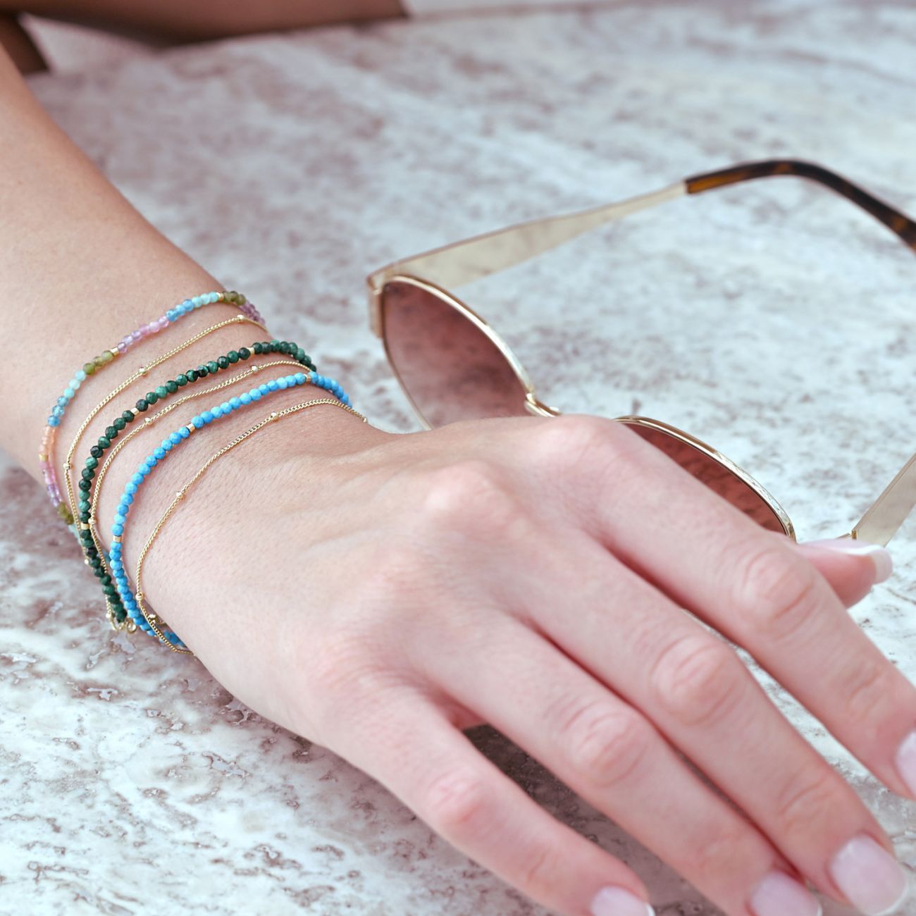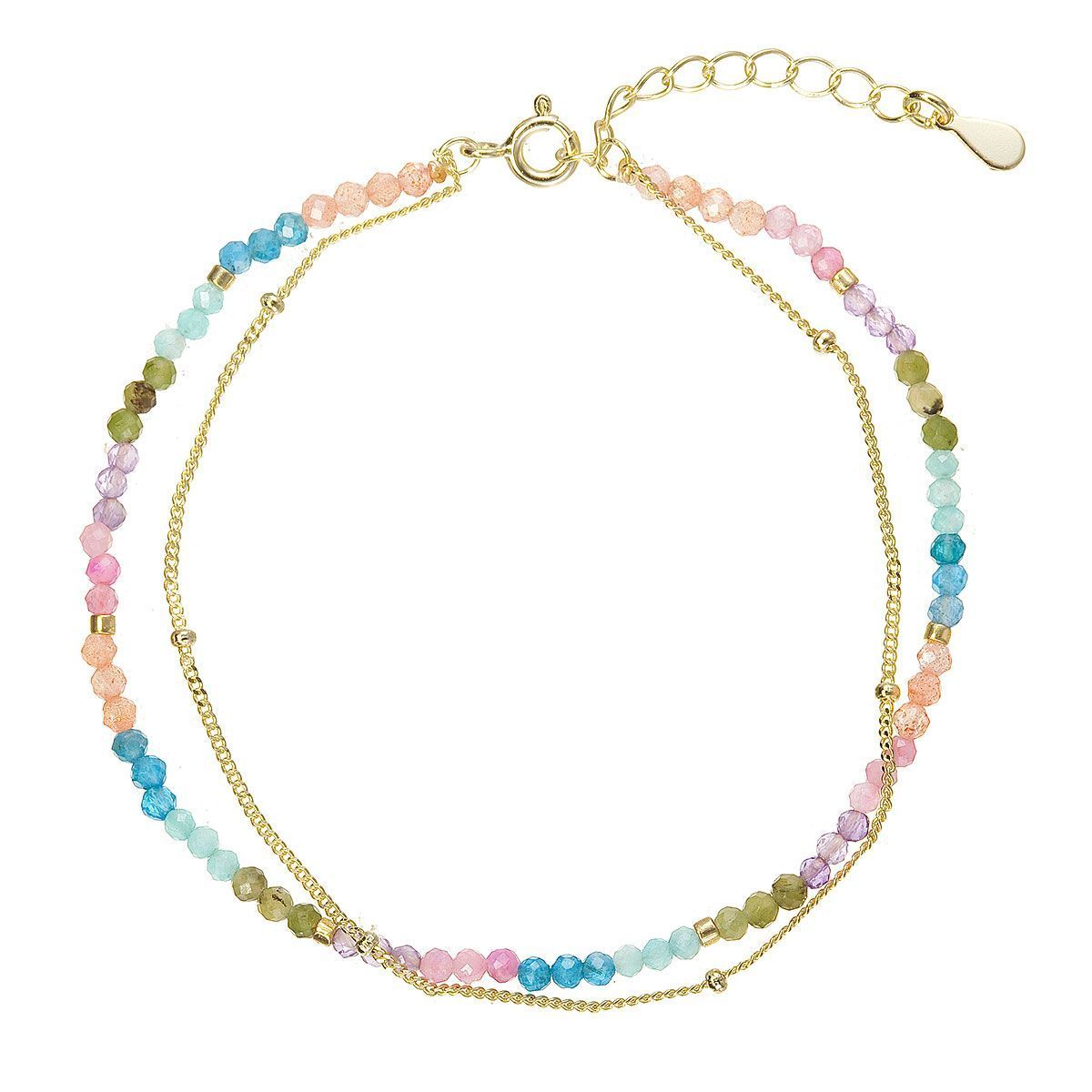 Tento stylový dvojitý náramek spojuje zlatavý řetízek z pozlaceného stříbra a barevný mix drobných korálků z pravých kamenů od růžových a oranžových tónů přes zelené až po modré. Kontrast teplého zlata s živou paletou minerálů vytváří výrazný, moderní a radostný design.