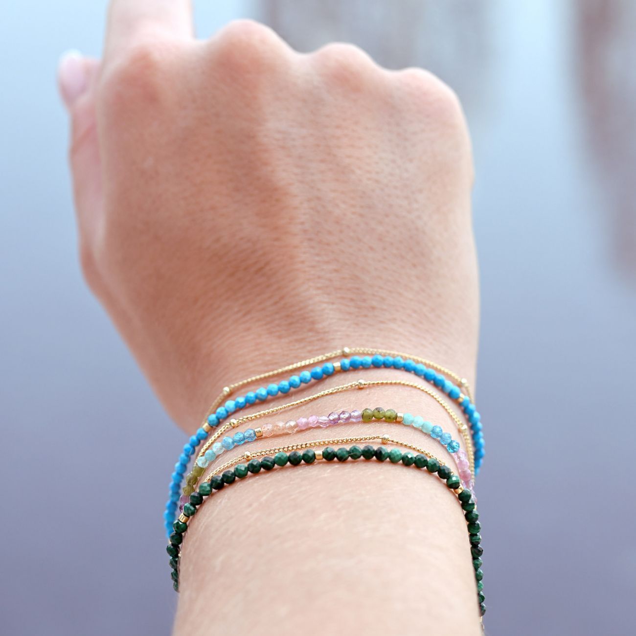Tento jemný dvojitý náramek spojuje tenký řetízek z pozlaceného stříbra a linii drobných broušených korálků z pravého howlitu barveného do zářivě modré barvy. Pozlacené stříbro ryzosti 925/1000 dodává šperku teplý zlatavý tón a elegantní vzhled. Náramek je vybaven zapínáním na karabinku a praktickou adjustou, díky níž lze jeho délku pohodlně upravit z 17 cm až o další 4 cm. Stylový, lehký a moderní doplněk, který dokonale rozzáří každý outfit.