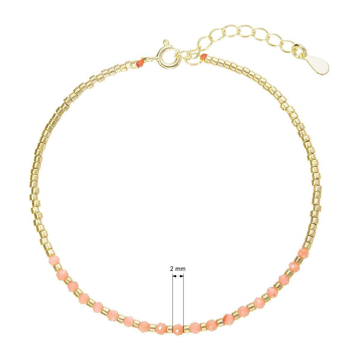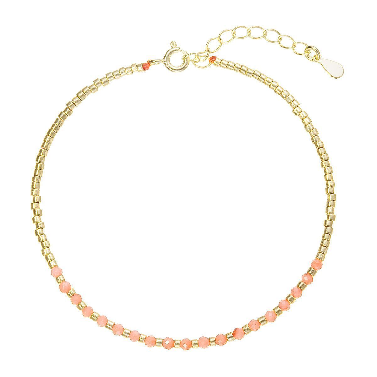 Tento jemný náramek je vyroben z pozlaceného stříbra a zdoben drobnými korálky z pravého oranžového korálu. Skládá se z malých zlatavých korálků, které tvoří většinu náramku, a z části teplými oranžovými kamínky korálu, jež mu dodávají energický a zářivý vzhled.